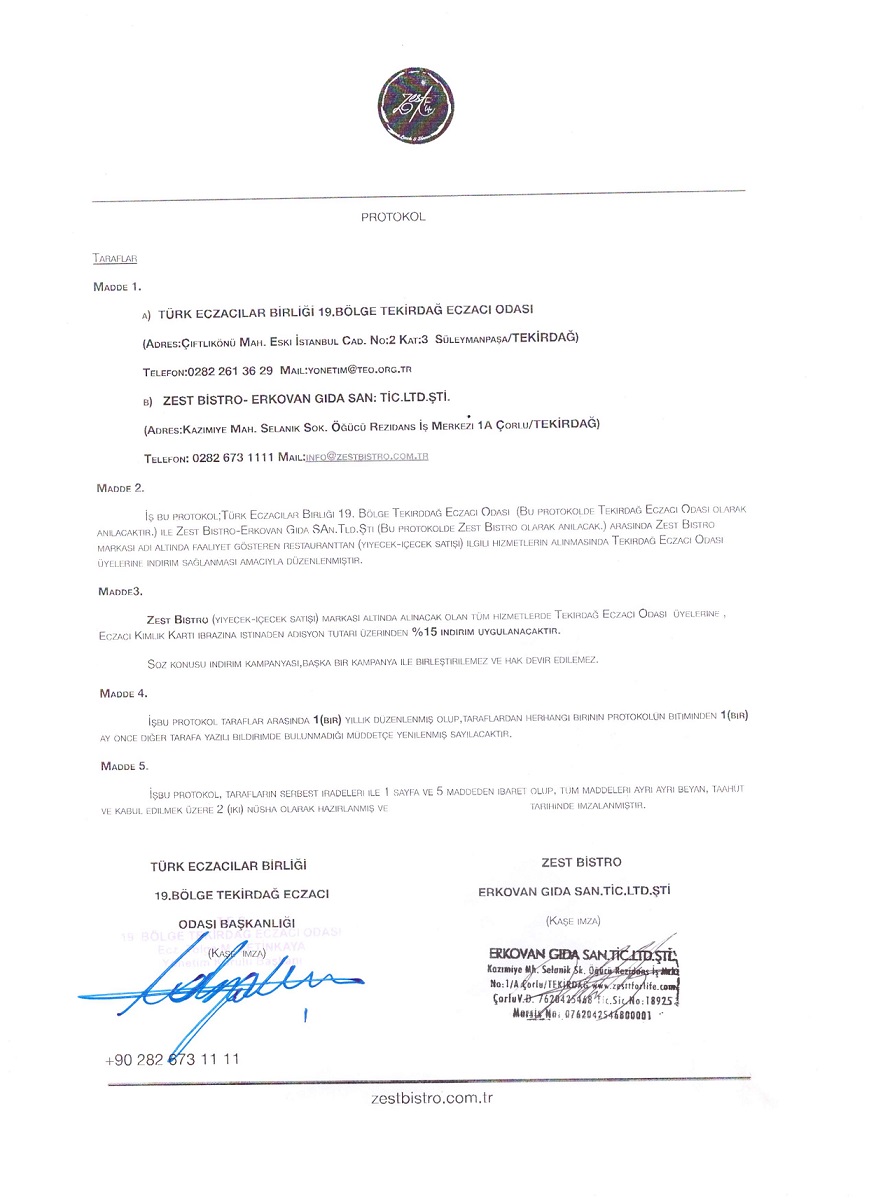 • ZEST BİSTRO VE ODAMIZ ARASINDAKİ ANLAŞMA