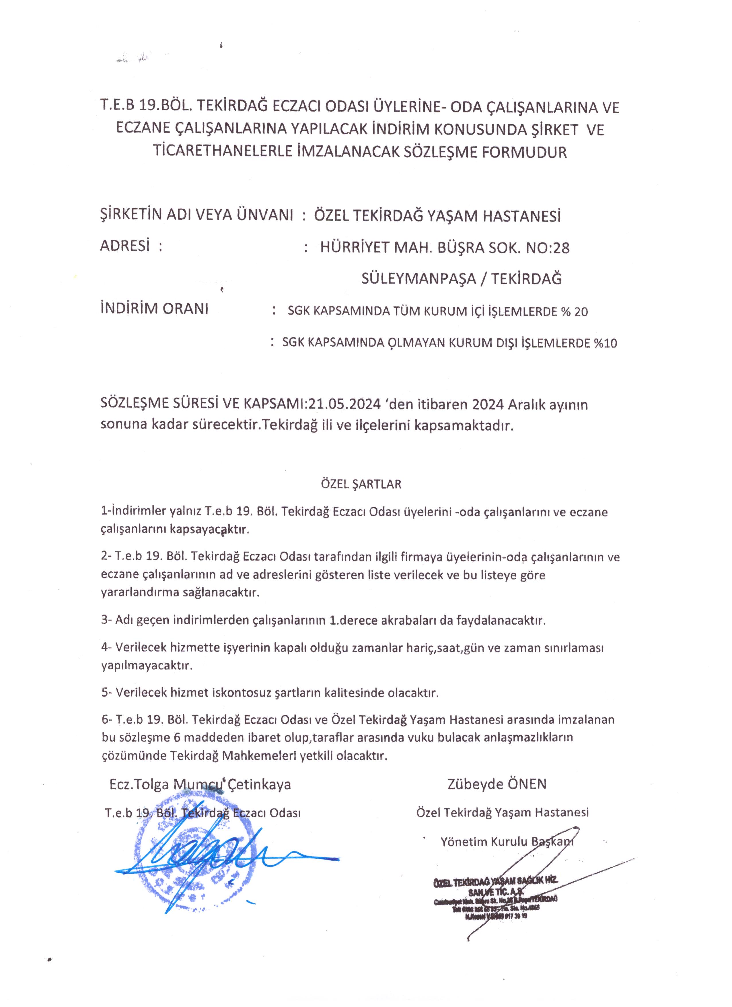 • ÖZEL TEKİRDAĞ YAŞAM HASTANESİ VE ODAMIZ ARASINDAKİ ANLAŞMA