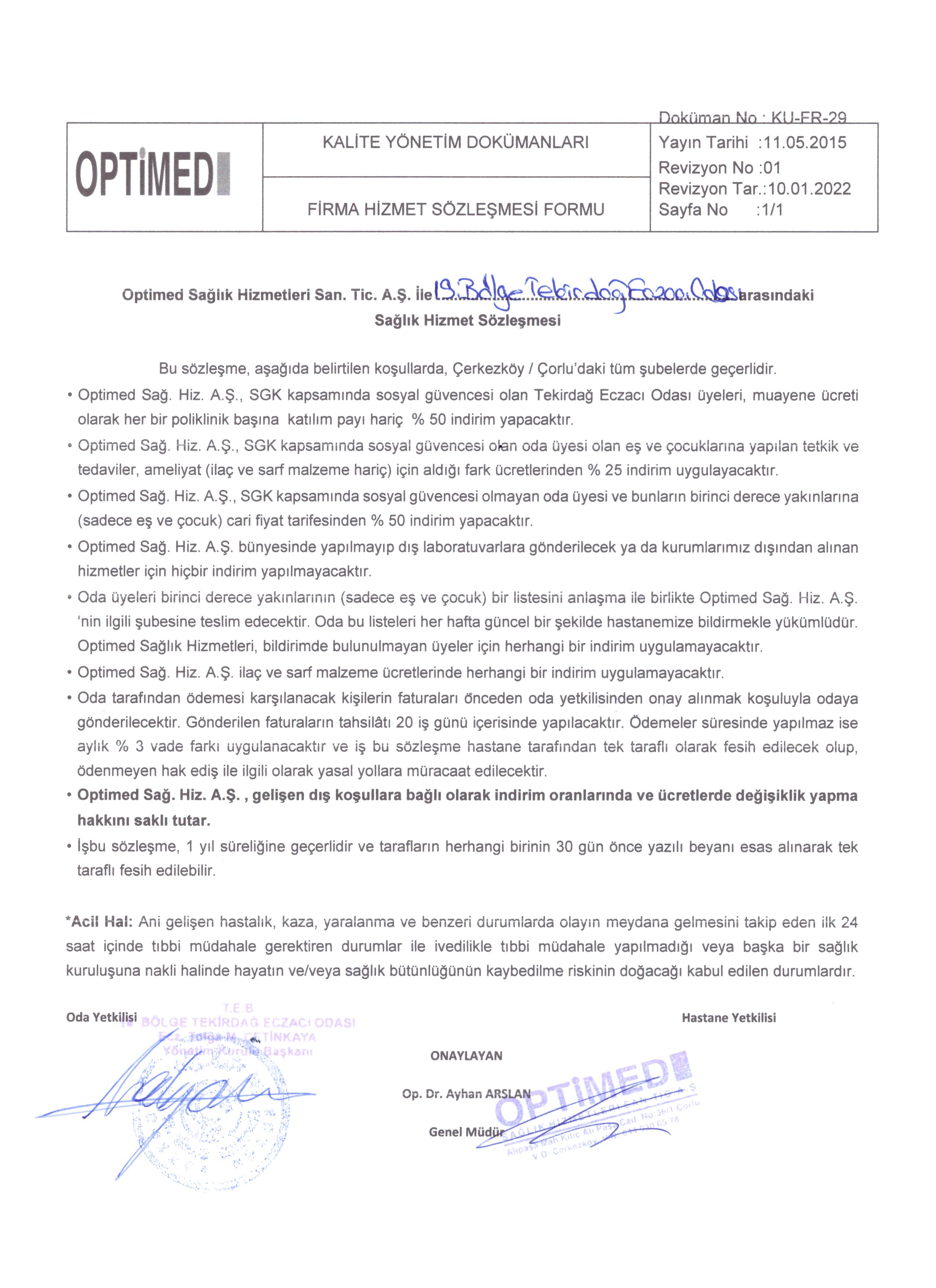 • OPTİMED HASTANESİ VE ODAMIZ ARASINDAKİ ANLAŞMA
